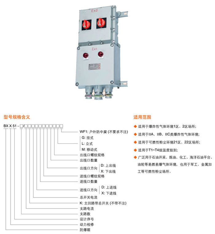 • 產(chǎn)品名稱:BXX51系列防爆動力檢修箱(ⅡB、ⅡC、tD、戶內(nèi)、戶外)