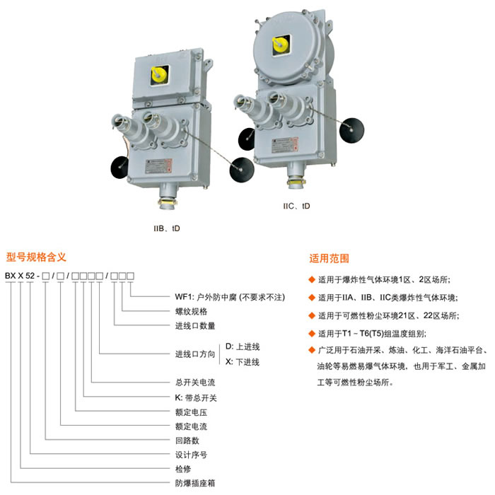 • 產(chǎn)品名稱:BXX52系列防爆檢修電源插座箱(ⅡB、ⅡC、tD)